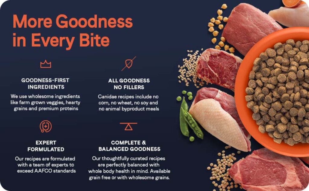 Canidae prides itself on offering balanced nutrition with real meat, healthy grains (or grain-free options), and a mix of vegetables, legumes, and superfoods. Their formulas often include: